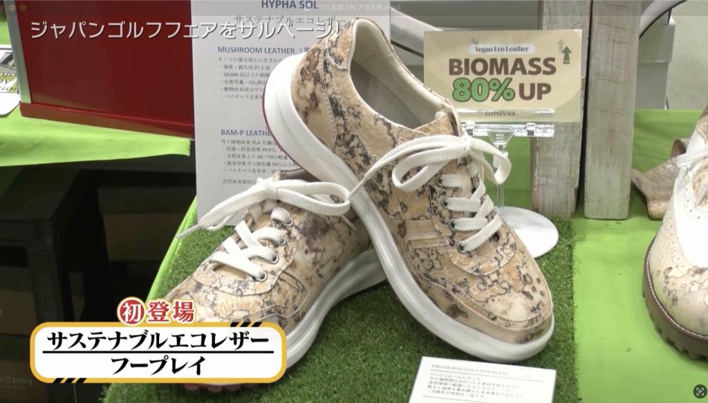 続いて訪れたのは、浅草に本社があるという紳士服メーカーが提案する新ブランド「フープレイ」さんです。キノコの菌糸体や竹の繊維など植物性由来の素材を使った新しいサスティナブルエコレザーを採用しているゴルフシューズを紹介してもらいました。