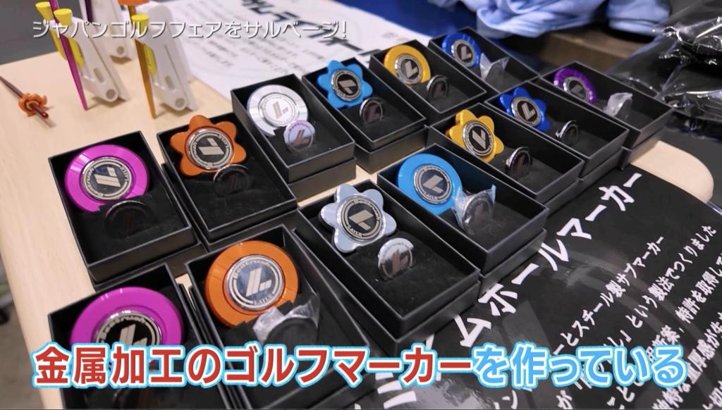 まず最初に、モータースポーツ用の部品を製造している「レイル」さんのブースにお邪魔しました。こちらでは自社の技術を活かした金属加工のゴルフマーカーを展示していました。しかしながら、華丸さんたちの興味を引いたのは、メタルマーカーだけではなく、オリジナルで作成したゴルフ専用のうちわでした。うちわをパタパタさせる動作がスイング時の手のローテーションに似ているということで、せっかくうちわを仰ぐなら、ローテーションの正しい動きが身に付くように持ち手をゴルフのグリップに似せて作ったとのことです。
