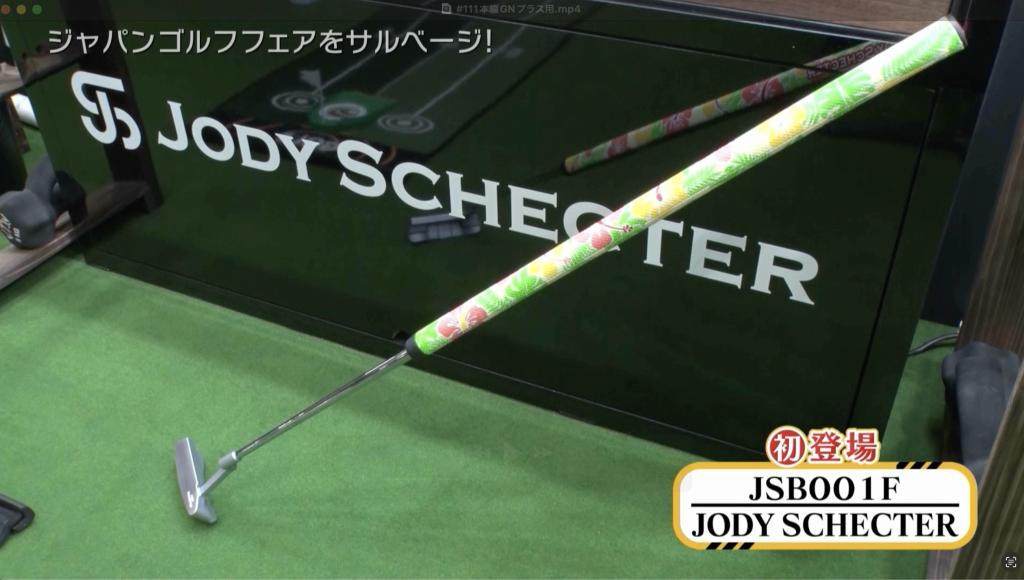 次に一行が訪れたのは、今回初出展だという「JODY SCHECTER」パターです。長さ55cmにも及ぶアロハグリップが特徴的なパターです。ワイドスタンスとセパレートグリップという立ち方・握り方とパターで、理論と商品をセットで提供しているとのことです。最後に実際に華丸さんがメソッドと商品を試してみました。